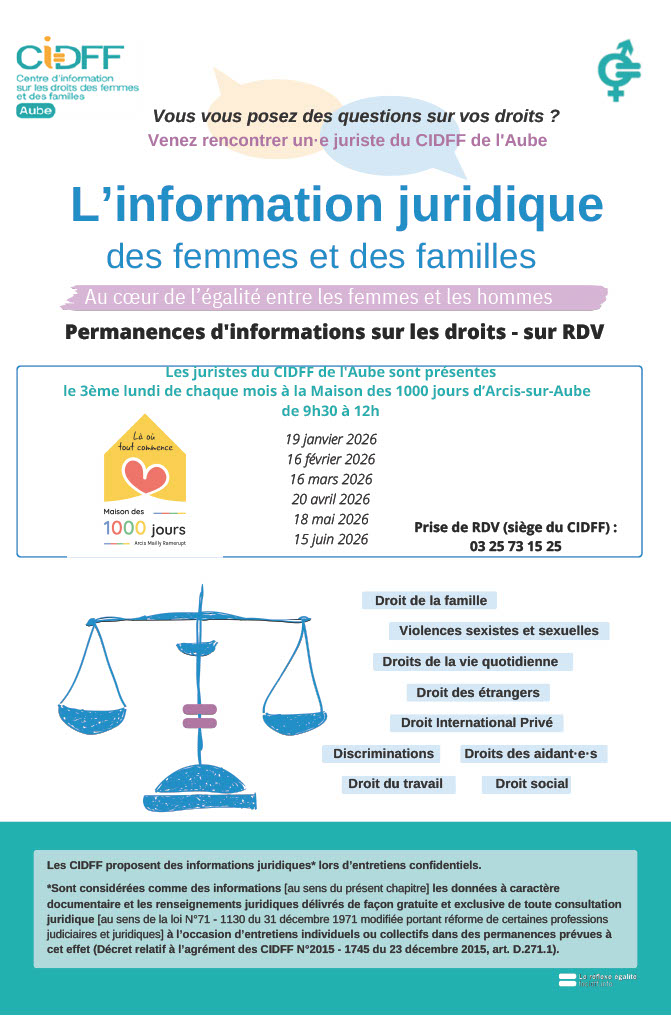 Le Centre d’Informations des Droits des Femmes et des Familles assure une permanence pour les futurs et jeunes parents d’enfants jusqu’à 3 ans au sein de la Maison des 1000 Jours Arcis Mailly Ramerupt.