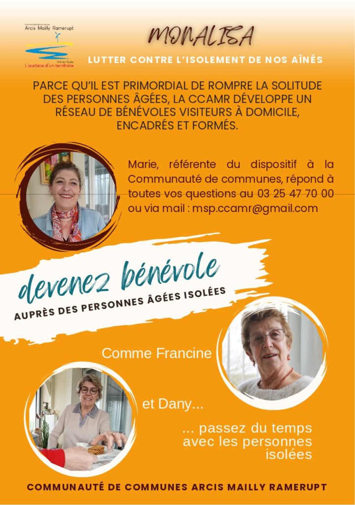 Parce qu’il est vital de rompre la solitude des personnes âgées, la Communauté de communes Arcis Mailly Ramerupt développe un réseau de bénévoles qui se déplacent chez les personnes isolées (au préalable rencontrées par Marie, la référente Monalisa sur notre territoire).